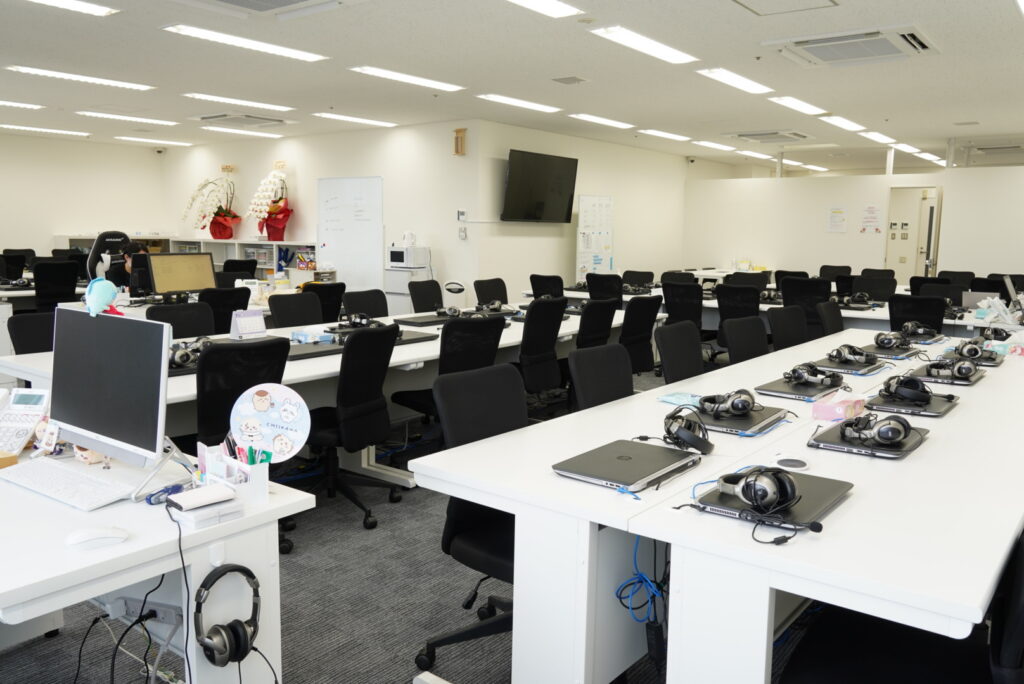 フロアを埋め尽くすほどのデスクに、テレアポ用のノートパソコンとイヤーモニターが置いてあります。