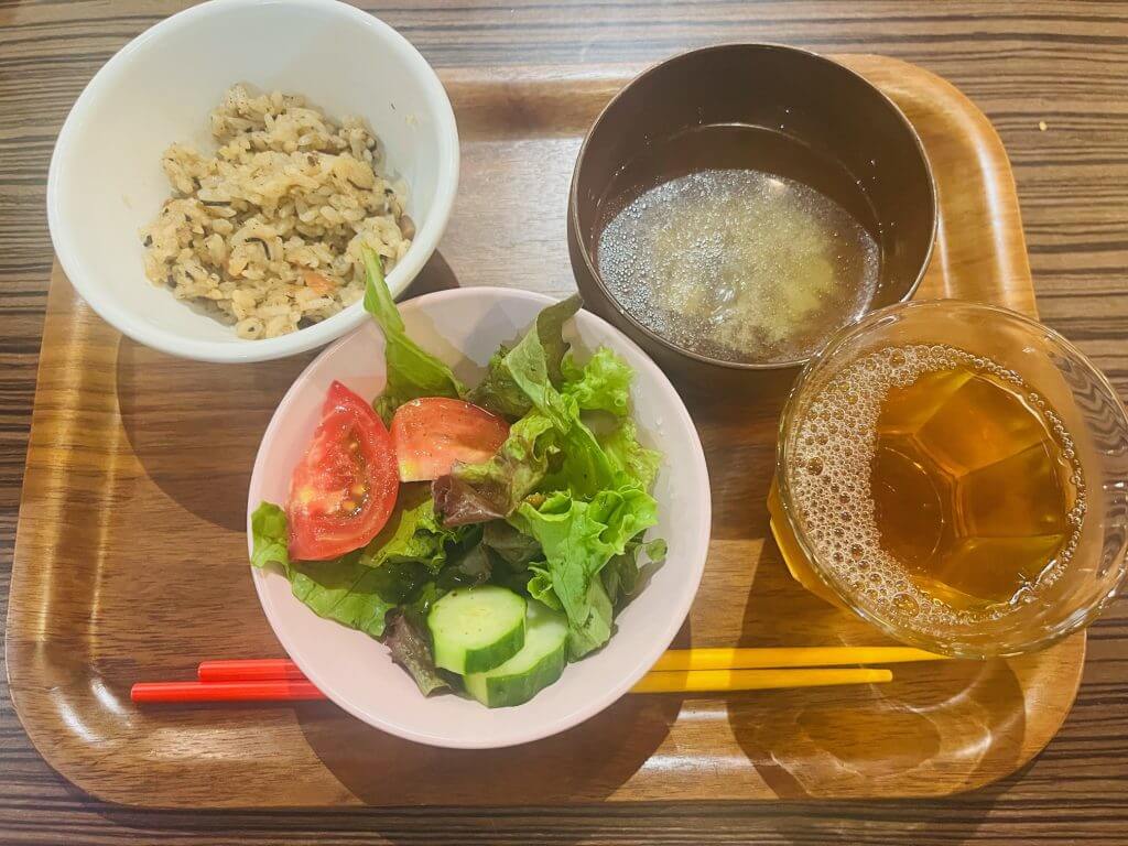 こちらは、セットについてきた食べ放題の炊き込みご飯とサラダとドリンクとスープ!