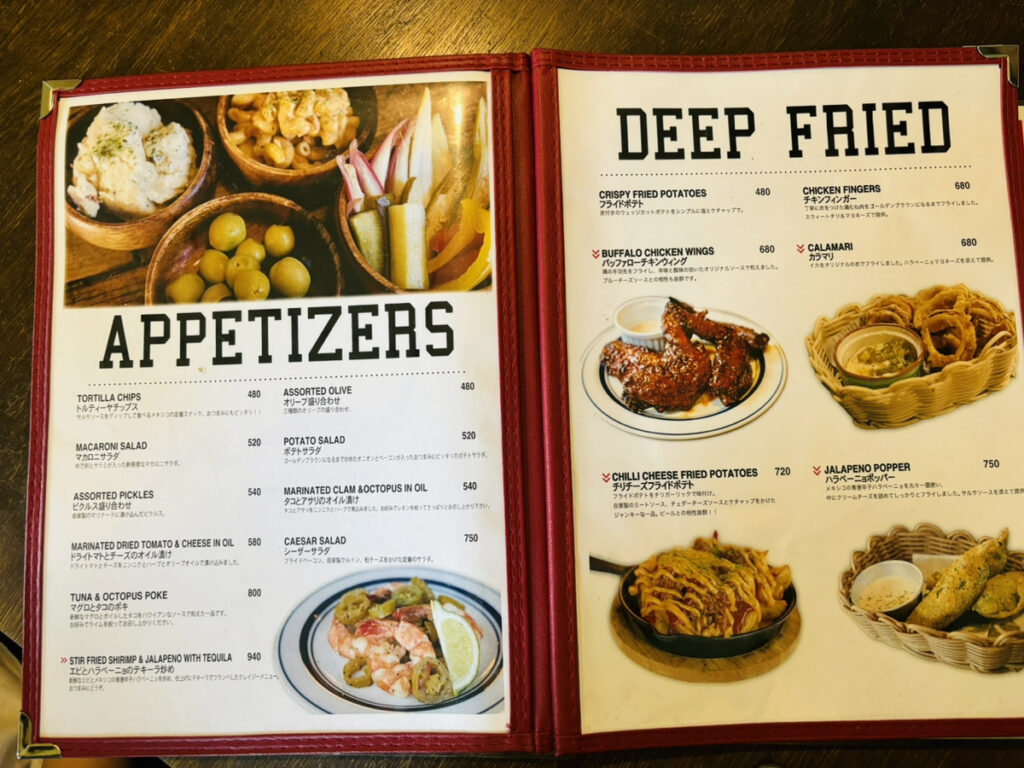見た瞬間「おいしそう~!!」ってなった私たちは、ピザを一人1枚、そしておつまみ系をこの中から2種類選んでシェアして食べることになりました。